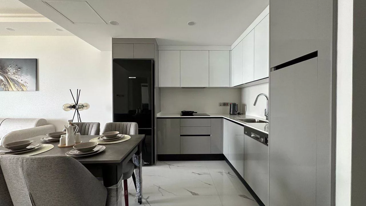 verbindet sich mit der Küche; der Balkon wird zum zweiten Wohnzimmer. Das Master-Schlafzimmer besitzt ein en-suite Bad,